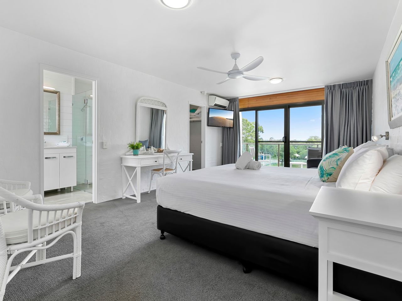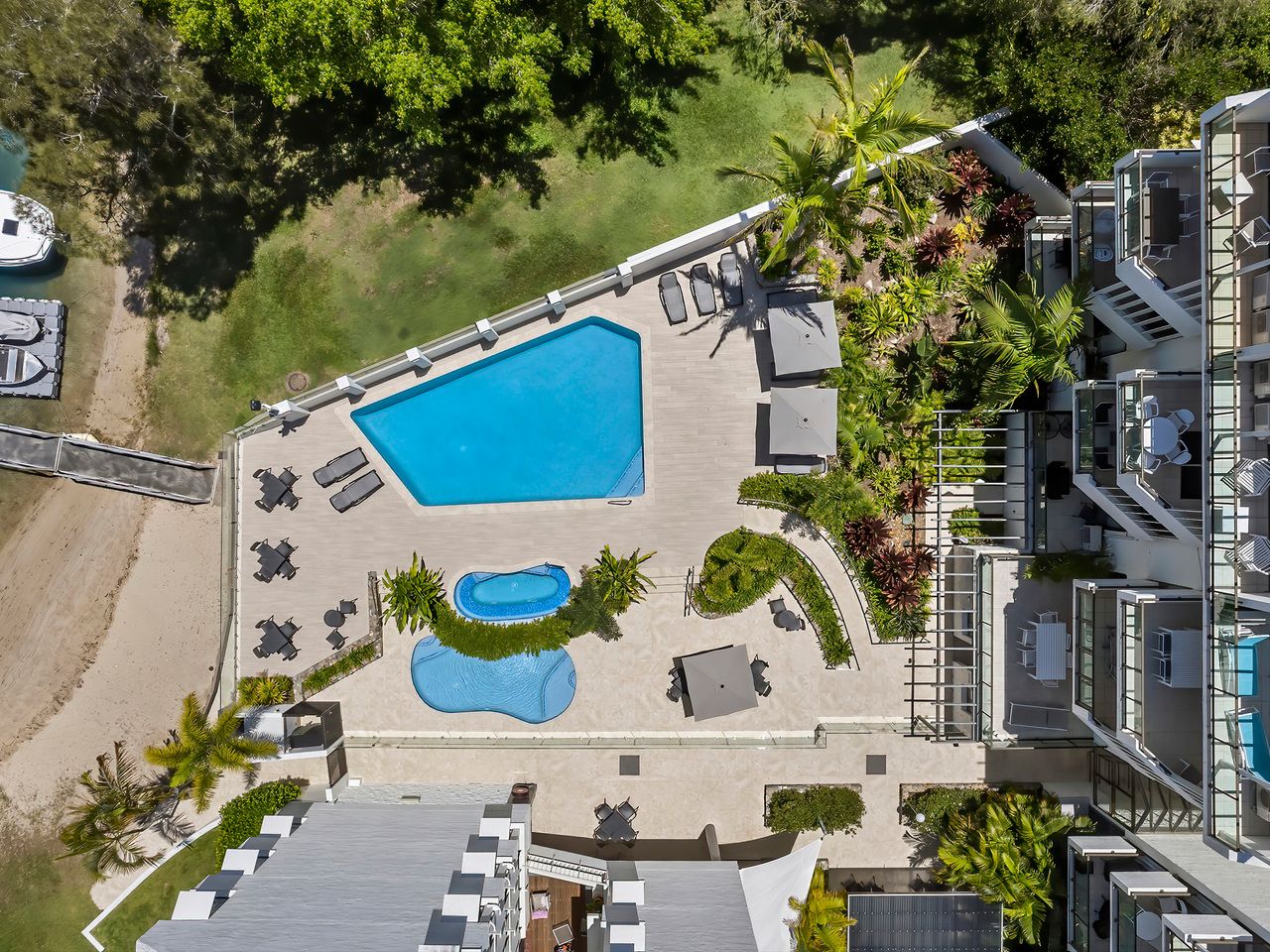 On the northerly side of the Resort are the two stunning recently renovated swimming pools, a spa, sun terraces, barbeque area and gardens, also Resort pontoon, tennis court and views out to the river across to the Noosa Spit.