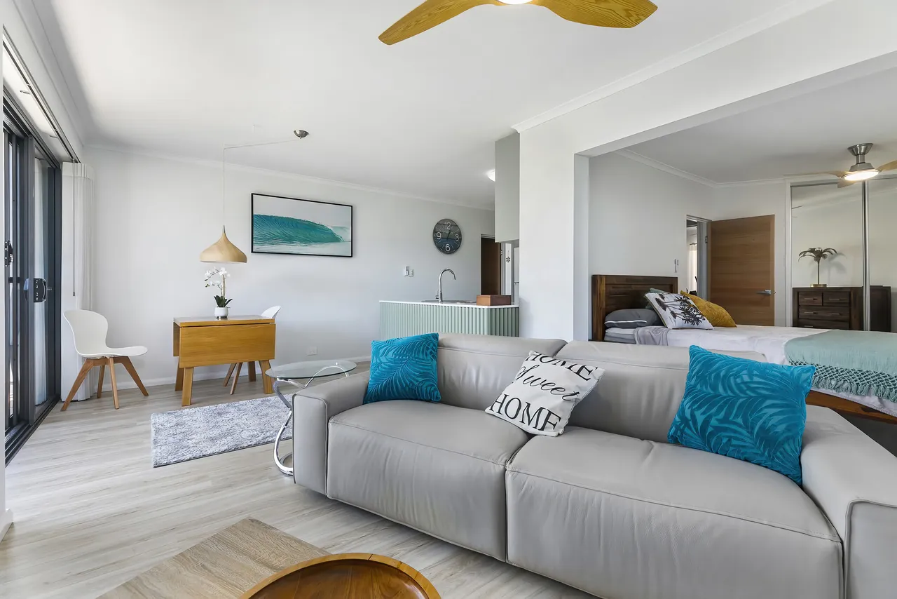 This delightful studio boasts a light and bright interior, tastefully furnished to create a serene ambiance that reflects the beauty of nature. The functional kitchenette and laundry add convenience to your stay, while the spacious main bedroom ensures comfort and relaxation. Your private balcony provides glimpses of the hinterland—a perfect spot to unwind, reflect, and enjoy sunset drinks after a day of beachcombing or shopping.