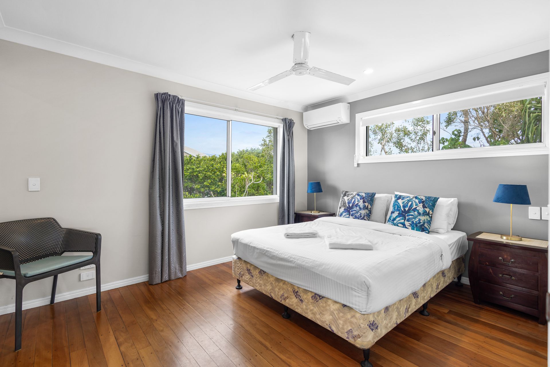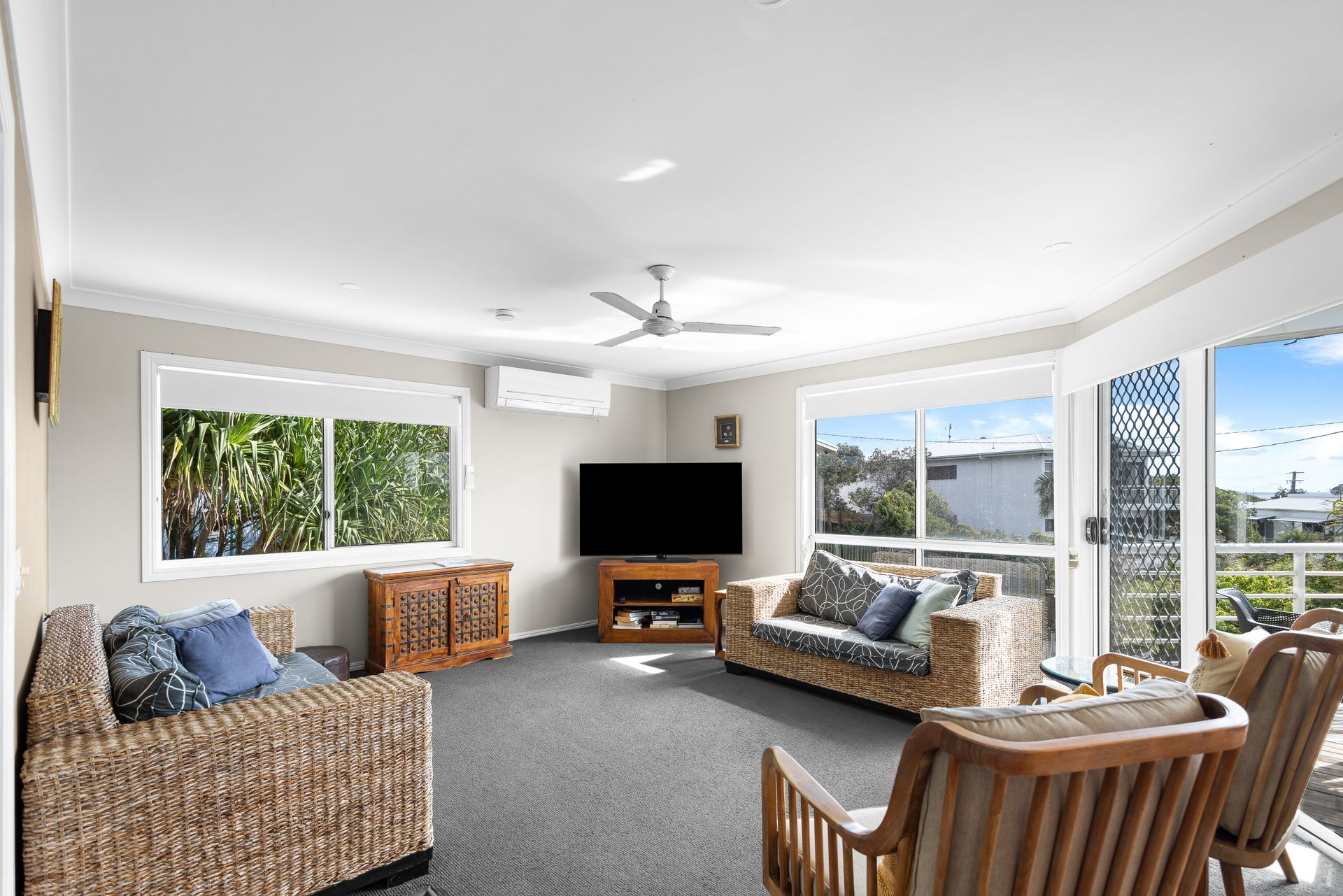 Amenities include air-conditioning, Wi-Fi, Netflix, two TVs, a DVD player, coffee machine, drinks fridge, microwave, dishwasher, washing machine, dryer, ceiling fans, outdoor furniture, and BBQ.